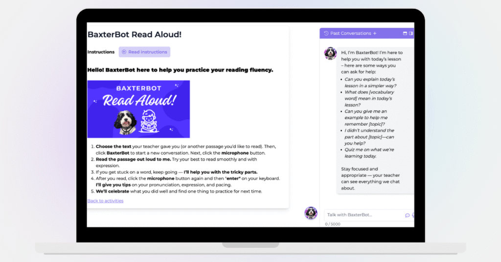BaxterBot provides differentiated reading assistance based on students’ academic reading levels. When learners ask for help, BaxterBot adjusts his explanations, definitions, and examples to meet them where they are, ensuring each student receives just-right guidance for comprehension and fluency practice.