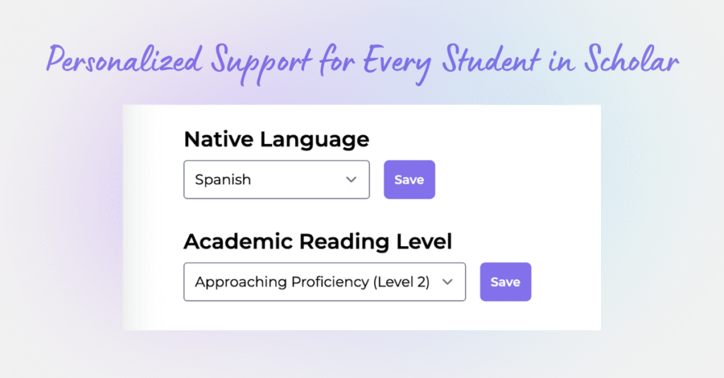 For multilingual learners, language should never be a barrier to literacy success. Scholar supports dual-language translation in 179 languages, allowing students to engage with BaxterBot responses in real time. This feature builds both comprehension and confidence while helping students stay connected to classroom learning.