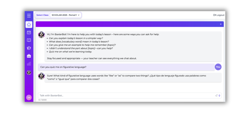 BaxterBot isn’t designed for one-off engagement. It’s built for repeated, structured practice that helps students explain their thinking, apply ideas, and work through misunderstandings. Insights make that learning visible — without adding more work for teachers.