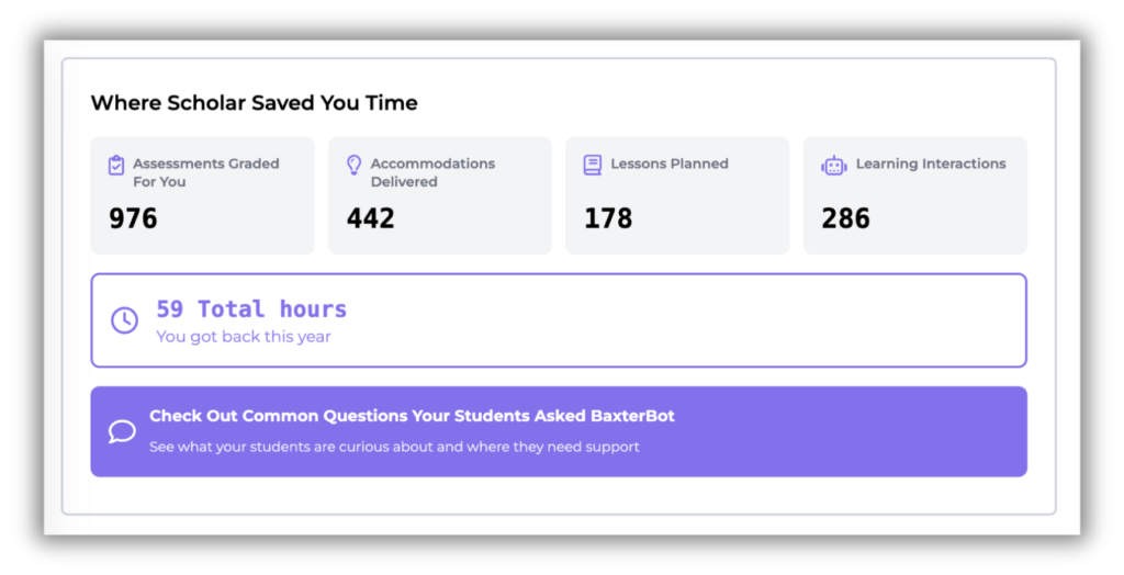 BaxterBot Insights help you move from “students used it” to “here’s what they understand.”