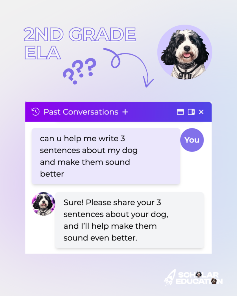 - Grade 2 (ELA): “can u help me write 3 sentences about my dog and make them sound better”