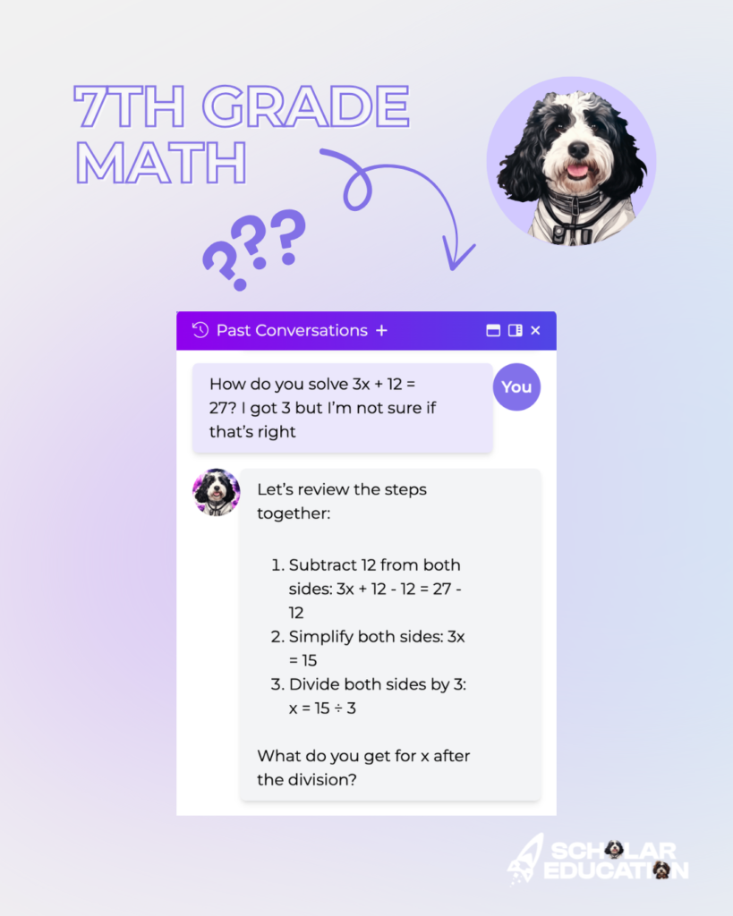 - Grade 7 (Math): “How do you solve 3x + 12 = 27? I got 3 but I’m not sure if that’s right”